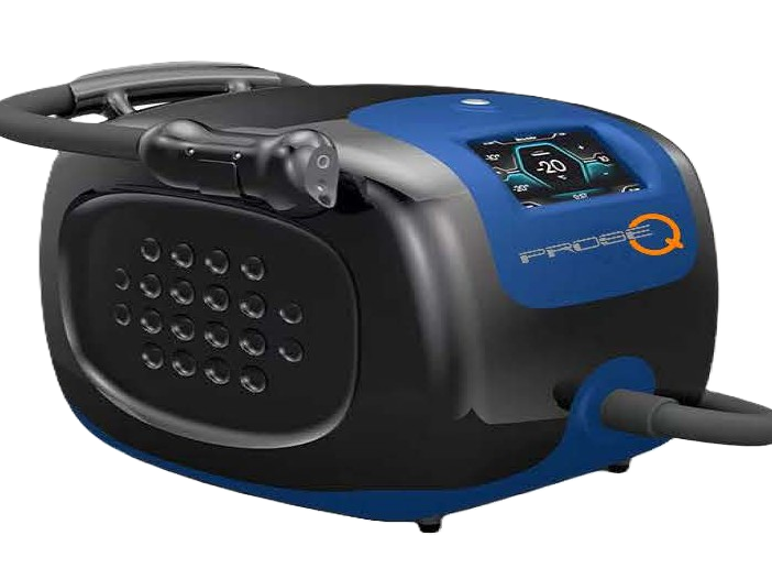 Mobiles elektrisches Kältetherapiegerät zur lokalen Anwendung. Der kühlende Luftstrom ermöglicht eine punktuelle und kontrollierte Dosierung bis -30°.